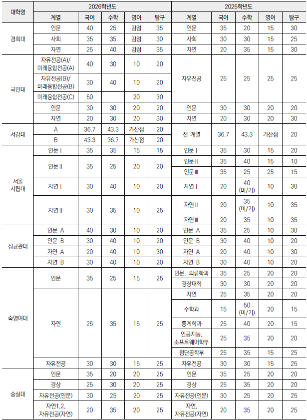 ●성균관대학교는 두 가지 환산식 중 더 유리한 점수를 반영하는 방식을 유지하였다. 인문계열은 국어 또는 수학의 반영 비율을 상향 조정하였으며, 자연계열은 수학 비율을 고정한 상태에서 국어와 탐구 영역의 비율에 차이를 둔 것이 특징이다. 또한 가군은 표준점수를, 나군은 백분위를, 다군은 표준점수에 탐구 상위 1과목만 반영하는 방식을 적용한다. 반영 비율은 동일하나 모집군별 반영 지표와 산출 방식이 상이하므로, 지원자는 각 모집군의 세부 반영 기준을 반드시 확인할 필요가 있다.
