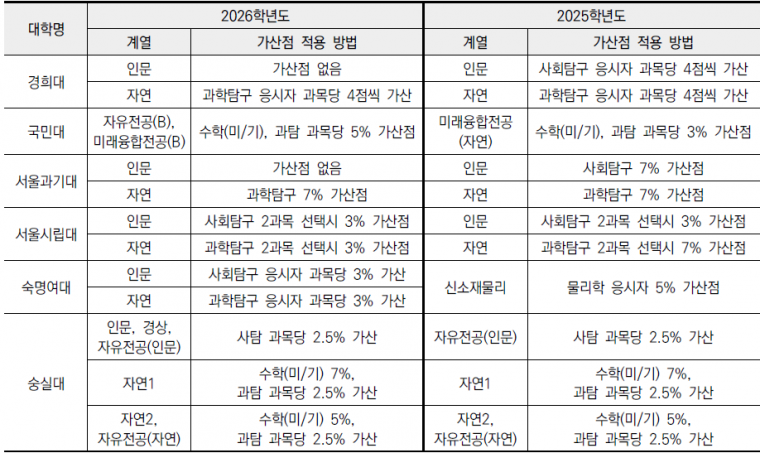●또한 서울시립대학교는 자연계열의 과학탐구 가산점을 종전 7%에서 3%로 축소하여, 특정 과목 편중을 완화하는 방향으로 변경하였다.