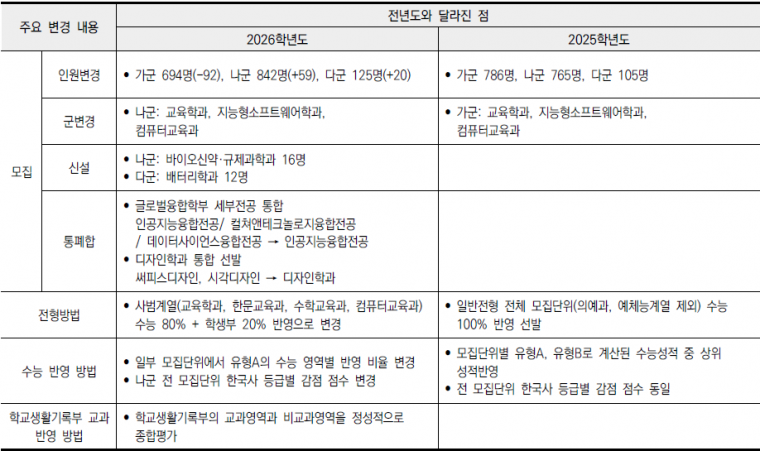 2026학년도에는 모집군별 인원 조정과 함께 일부 학과의 통합 및 신설이 이루어졌다.