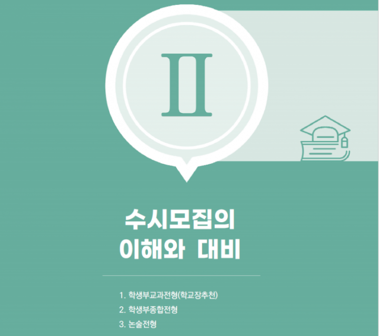 ●수시모집은 크게 학생부교과전형, 학생부종합전형, 논술전형으로 나뉘며, 각 전형은 평가 기준과 준비 전략이 명확히 다르다.
