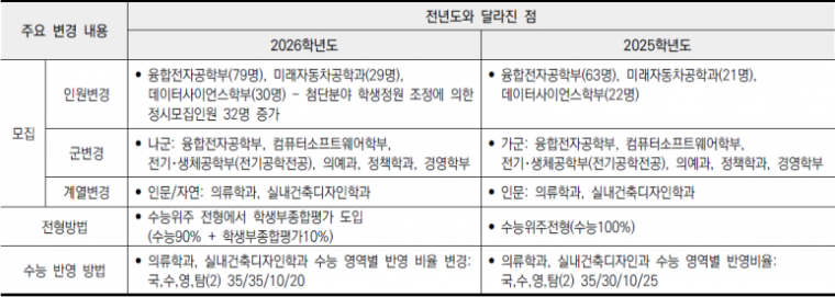 2026학년도에는 첨단 분야 모집인원 확대와 함께 수능위주 전형에 학생부종합 평가가 새로 도입되었다.