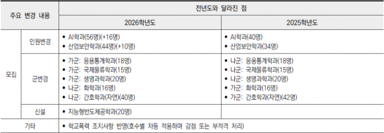 또한 지능형반도체공학과가 신설되었고, 학교폭력 조치사항 반영 기준이 강화되었다.