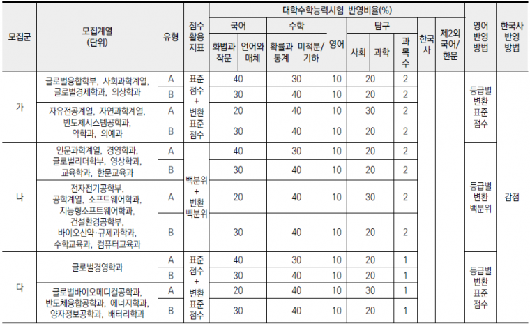 또한 과학탐구 선택자에게는 최대 5%의 가산점이 부여되어 자연계열 수험생에게 유리하게 작용한다.
